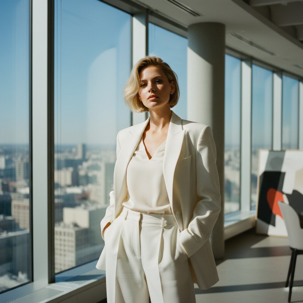 Портрет девушки 25 лет с короткими светлыми волосами, уверенный взгляд. Она одета в белый деловой костюм оверсайз. Локация: современный офис с панорамными окнами, солнечный день. Освещение: мягкий студийный свет, кинематографическое качество, высокое разрешение 8k, стиль фотореализм, снято на 35 mm.